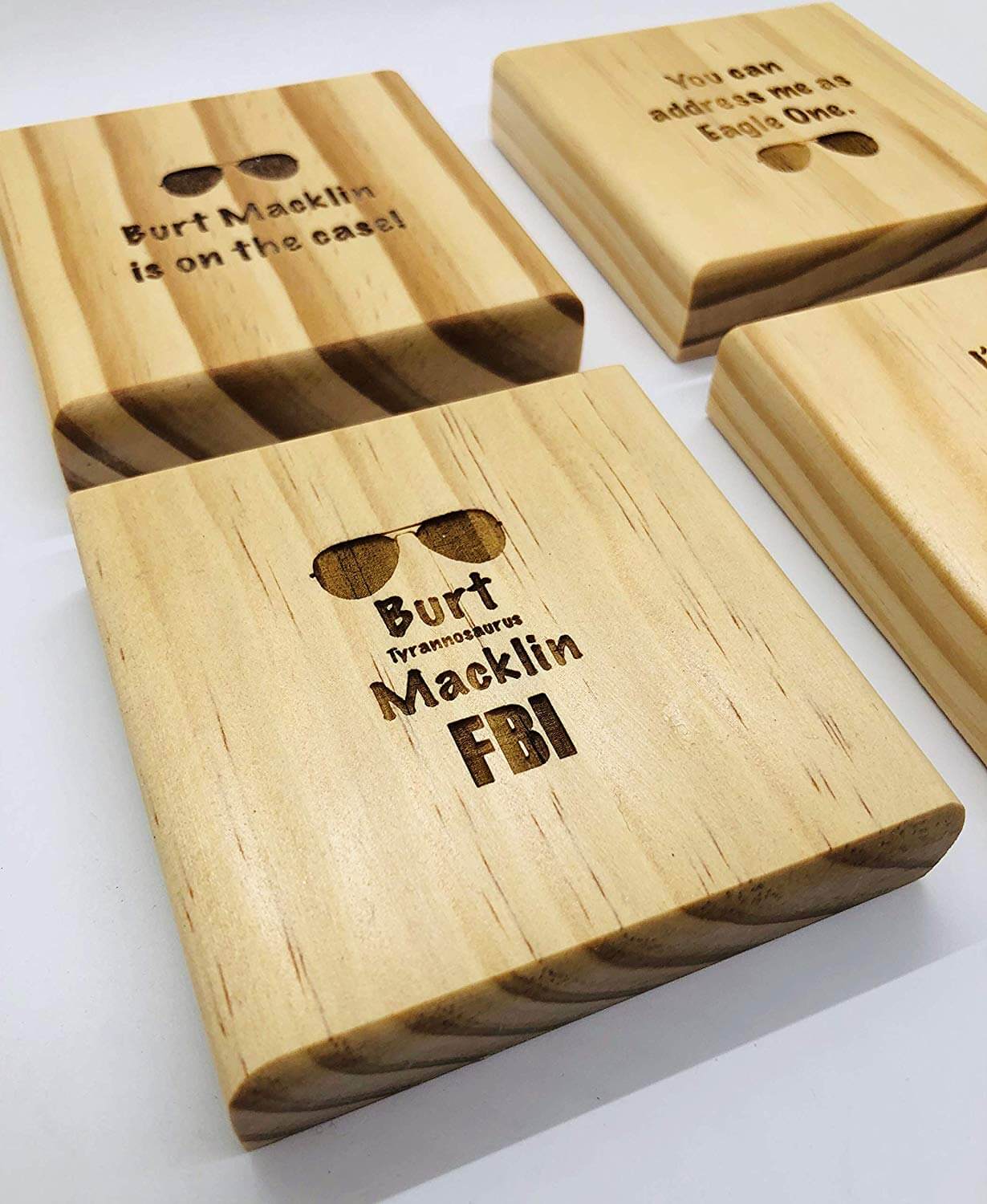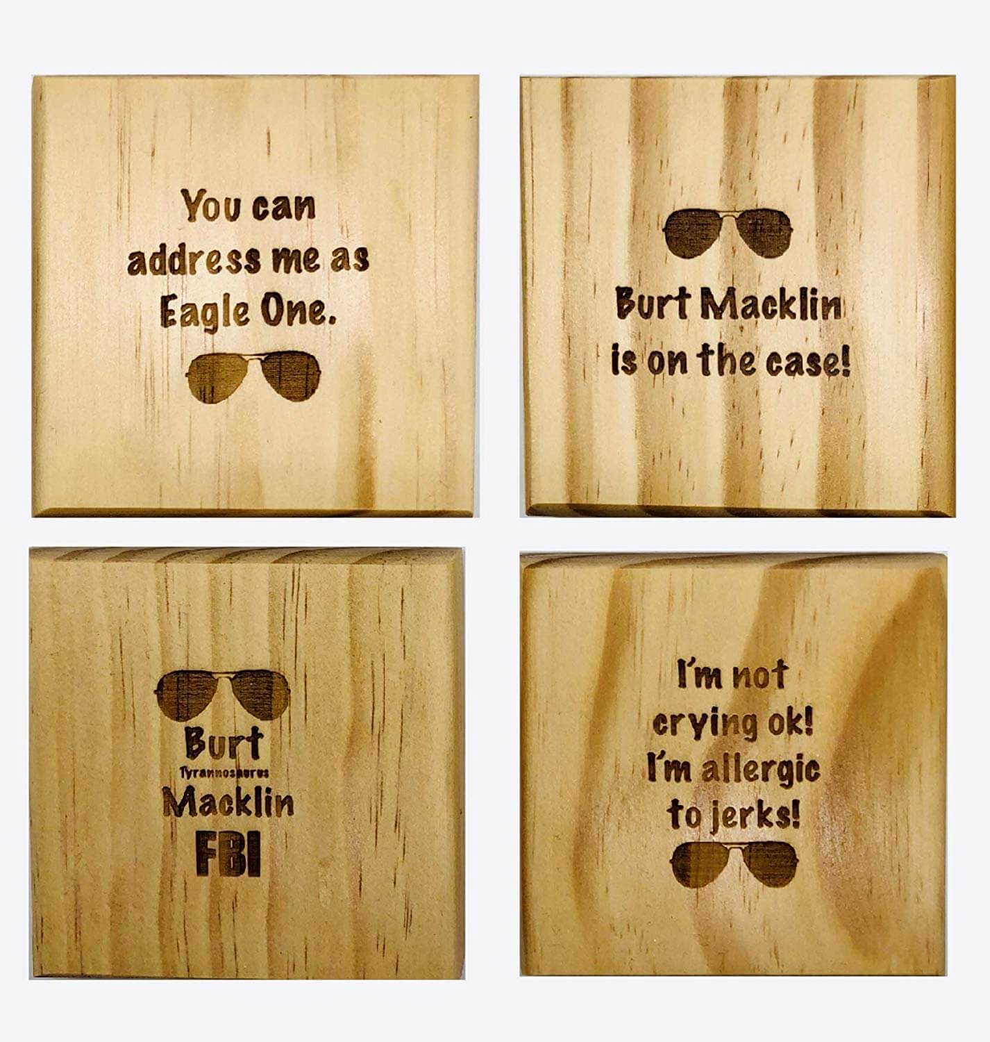 Parks and Recreation inspired permanent engraved gift set of 4 wood coasters: The best of Andy Dwyer’s alter ego: Burt Macklin FBI! Our coasters are made with love in small batches. Includes one of each of the following: - You can address me as Eagle one - Burt Macklin is on the case! - Burt Tyrannosaurus Macklin FBI - I’m not crying okay! I’m allergic to jerks! {Product Dimensions:} Approximate Size: 3-3/4" x 3-3/4" Approximate Thickness: 1/2"